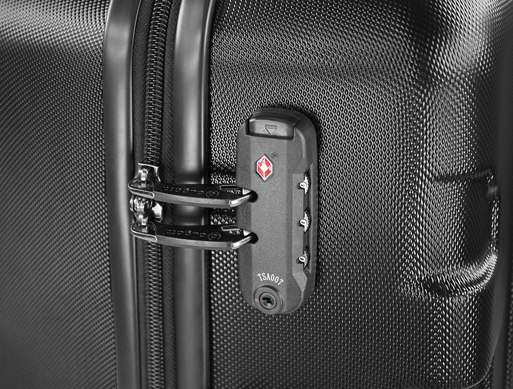 Внешняя организация: телескопическая ручка, кодовый замок TSA, 4 двойных колеса, боковая ручка, ручка на дне