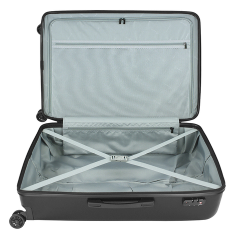 ЧЕМОДАН KALLISTO Серия Kallisto воплощает собой нашу страсть к путешествиям. Тонкие диагональные полосы и стильная поверхность с металлическим оттенком подчёркивают непринужденную привлекательность коллекции, представленной в чёрном цвете. Логотип Bugatti аккуратно встроен в металлический шильдик на корпусе. Четыре двойных резиновых колеса просты в управлении и очень удобны. Они могут вращаться на 360°, обеспечивая лёгкий ход по любой поверхности при сохранении полной манёвренности. Лёгкая выдвижная телескопическая ручка удобно фиксируется в нескольких положениях. Замок TSA с трехзначным кодом надёжно защищает содержимое багажа от несанкционированного доступа, а дополнительная ручка на дне корпуса облегчает загрузку и выгрузку чемодана. Продуманная концепция больших отделений с внутренней перегородкой на молнии позволяет максимально практично использовать внутреннее пространство. СВОЙСТВА Внутренняя организация: основное отделение на молнии с 2 отсеками, сетчатой перегородкой с карманом на молнии, карманом на молнии и 2 фиксирующими ремнями Внешняя организация: телескопическая ручка, кодовый замок TSA, 4 двойных колеса, боковая ручка, ручка на дне Размер: 50,5 x 30,5 x 74 см Объём: 100,80 л Вес: 4,40 кг Материал: АБС-пластик