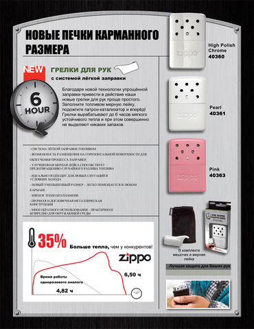 Благодаря новой технологии упрощённой заправки привести в действие наши грелки для рук проще простого. Заполните топливом мерную лейку, подожгите патрон-катализатор и вперёд! Грелки вырабатывают до 6 часов мягкого устойчивого тепла и при этом совершенно не выделяют никаких запахов.