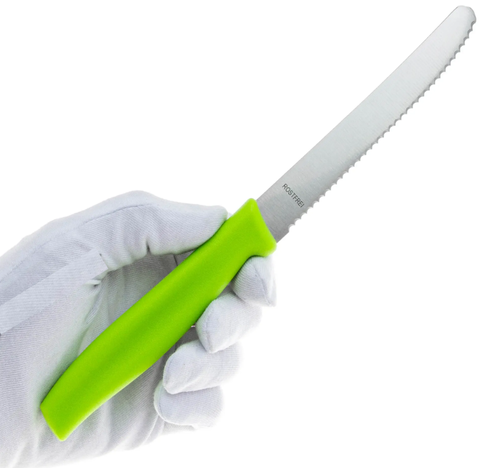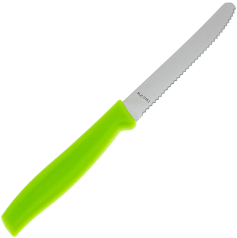Лезвие ножа изготовлено из высококачественной нержавеющей стали, подходит для широкого спектра точных кулинарных задач и обеспечивает идеальную нарезку. Лёгкая эргономичная рукоять изготовлена из ударопрочного нескользящего пластика, обеспечивает максимальный комфорт и контроль. Заводская серрейторная заточка сохраняет остроту долгие годы.