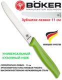 Универсальный кухонный нож BOKER с 11-сантиметровым зубчатым лезвием идеально подходит для нарезки овощей, фруктов, сосисок, колбас, стейков, небольших кусков мяса и кондитерских изделий. Благодаря эргономичной ручке и идеальному размеру вы можете легко использовать этот нож для самых разных задач на кухне.