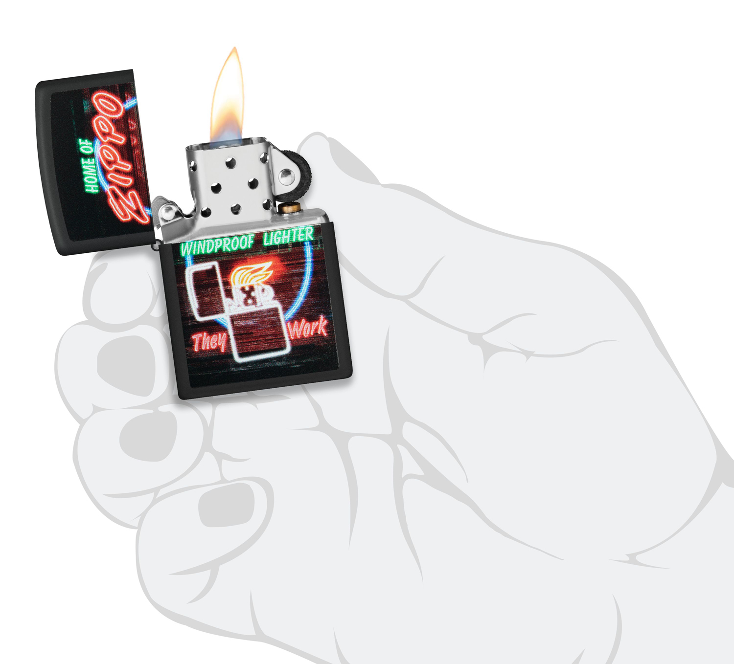 Теперь вам не обязательно ехать в Брэдфорд, штат Пенсильвания, чтобы увидеть знаменитую неоновую вывеску Zippo! Эта зажигалка Black Matte представляет собой слегка уменьшенную версию культовой сияющей красоты, представленной в великолепном цветном изображении.