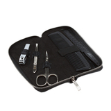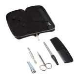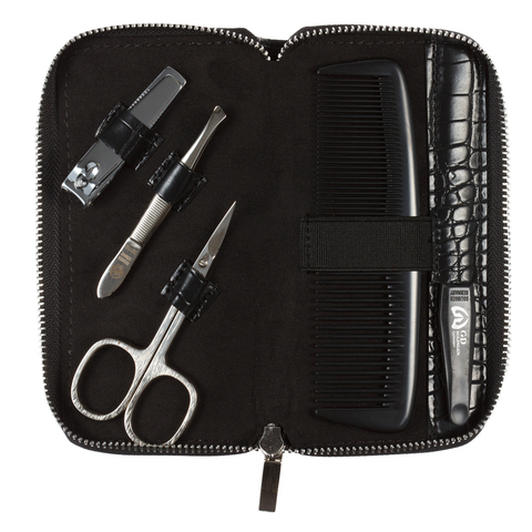 Ножницы, пилка, пинцет, книпсер для ногтей, расческа. Футляр: искусственная кожа, цвет черный, фактура - крокодил
