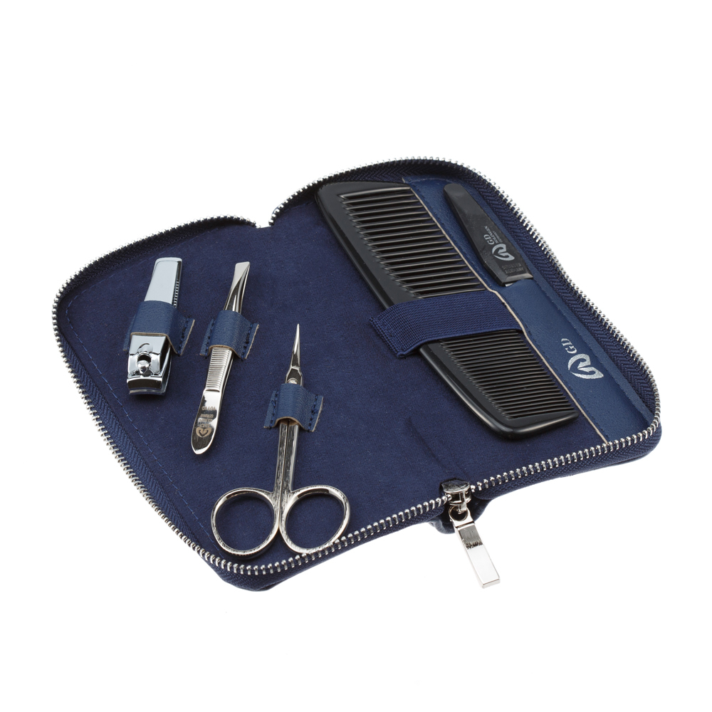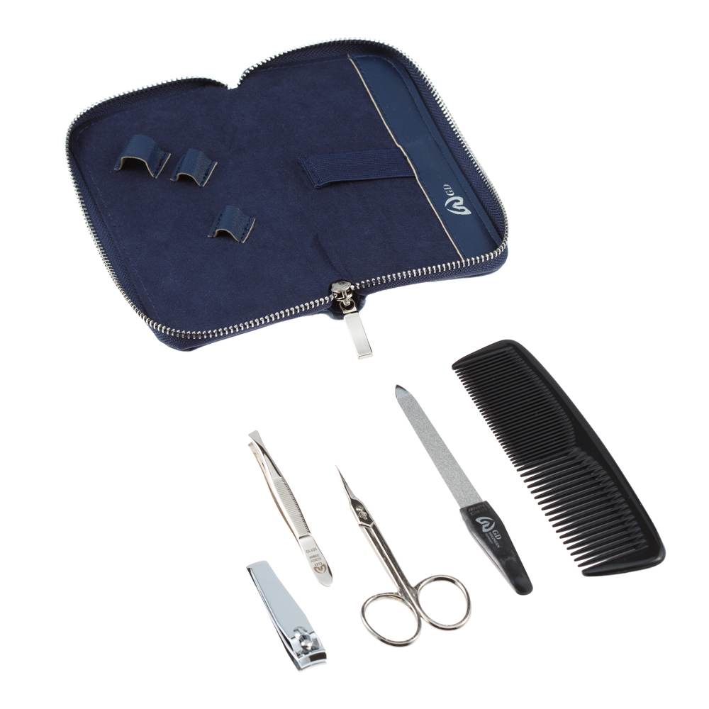 Ножницы, пилка, пинцет, книпсер для ногтей, расческа. Футляр: искусственная кожа, цвет синий, фактура - гладкая