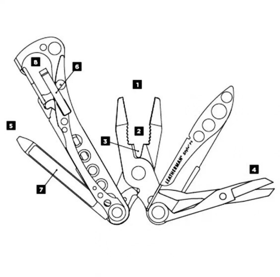 1. Острогубцы с пружинящим механизмом 2. Пассатижи с пружинящим механизмом 3. Кусачки для проволоки с пружинящим механизмом 4. Ножницы с пружинящим механизмом | 5. Плоская отвертка / отвертка Phillips 6. Щипчики 7. Пилочка для ногтей 8. Карабин / Открывалка для бутылок |