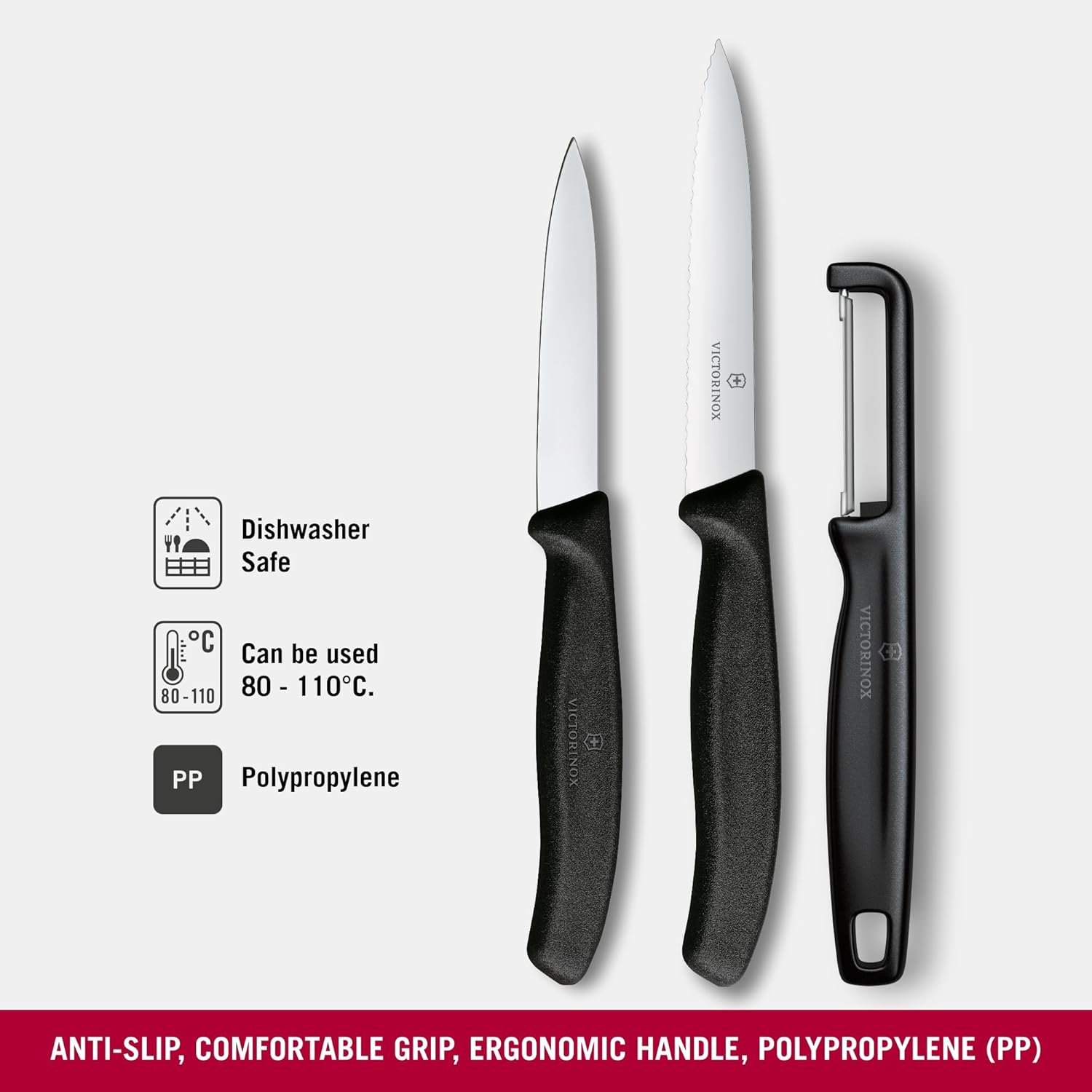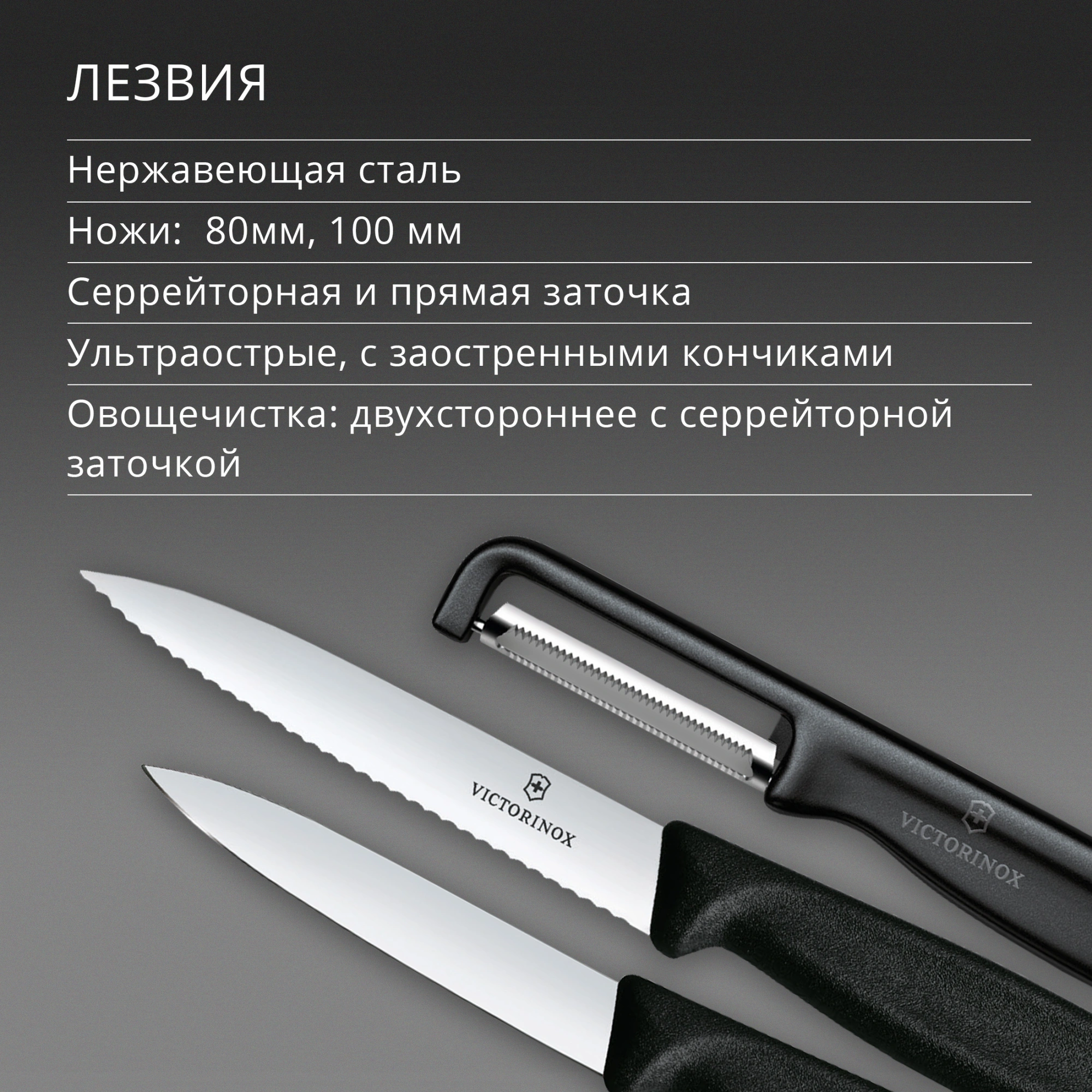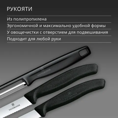 Лезвие ножей Victorinox изготовлено из высококачественной нержавеющей стали. Рукоять из ударопрочного пластика. Уникальная заводская заточка сохраняет остроту долгие годы.