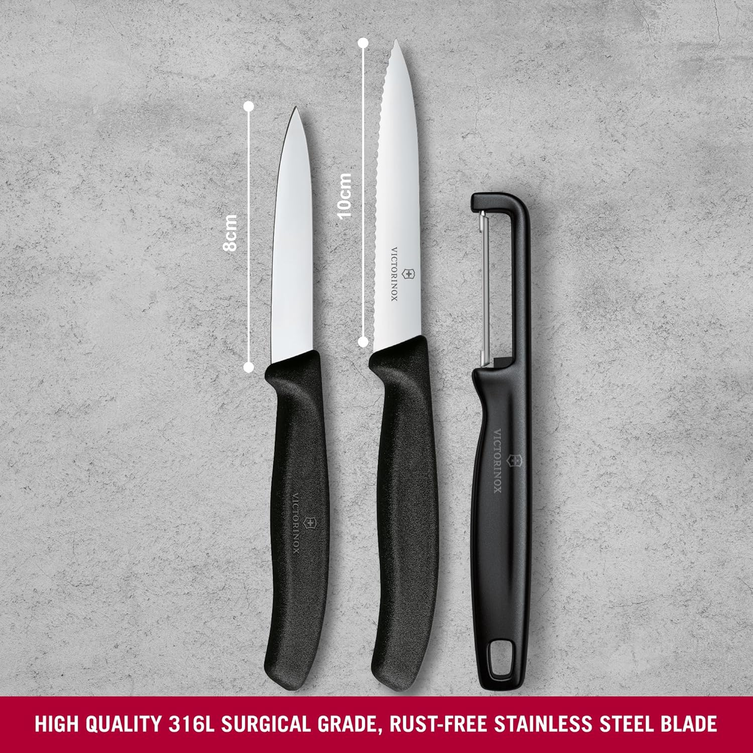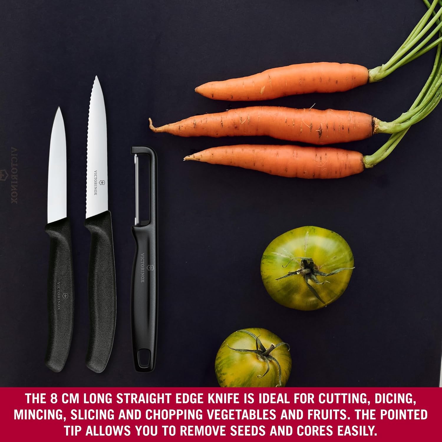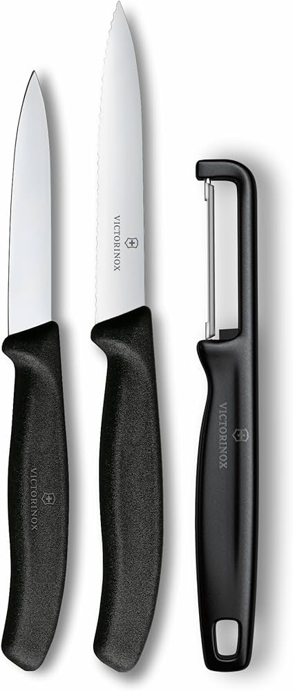 Универсальные швейцарские кухонные ножи Victorinox с 8-11-сантиметровым лезвием идеально подходят для резки и чистки овощей и фруктов, а также нарезки сосисок, колбас, стейков, небольших кусков мяса и кондитерских изделий.