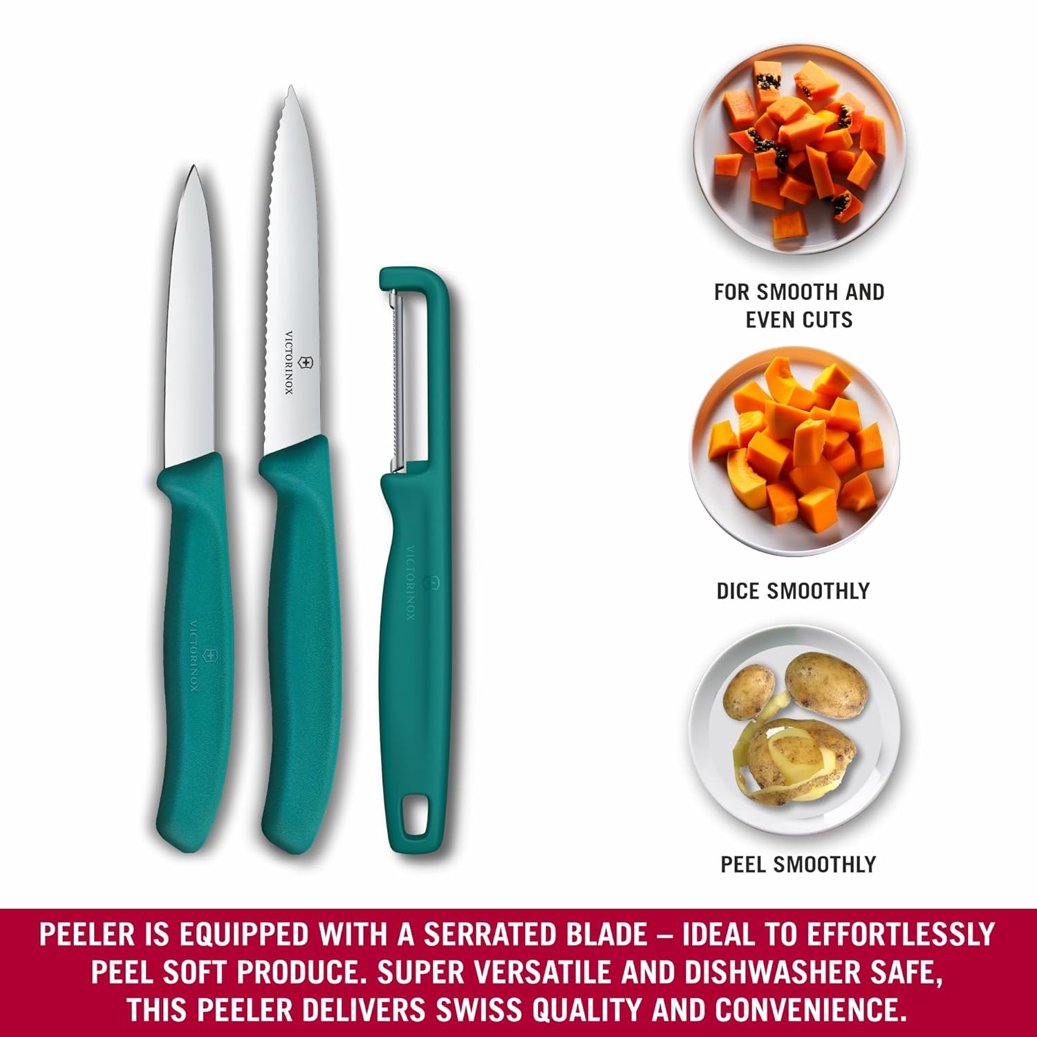 Универсальные швейцарские кухонные ножи Victorinox с 8-11-сантиметровым лезвием идеально подходят для резки и чистки овощей и фруктов, а также нарезки сосисок, колбас, стейков, небольших кусков мяса и кондитерских изделий.