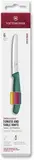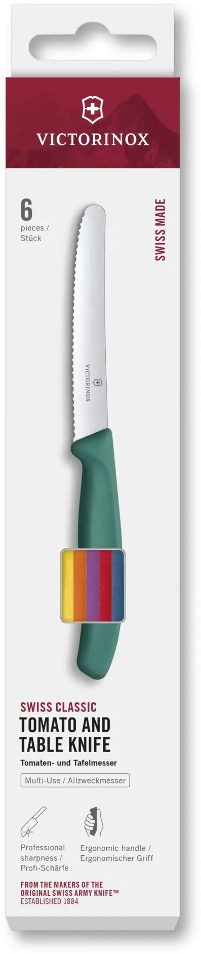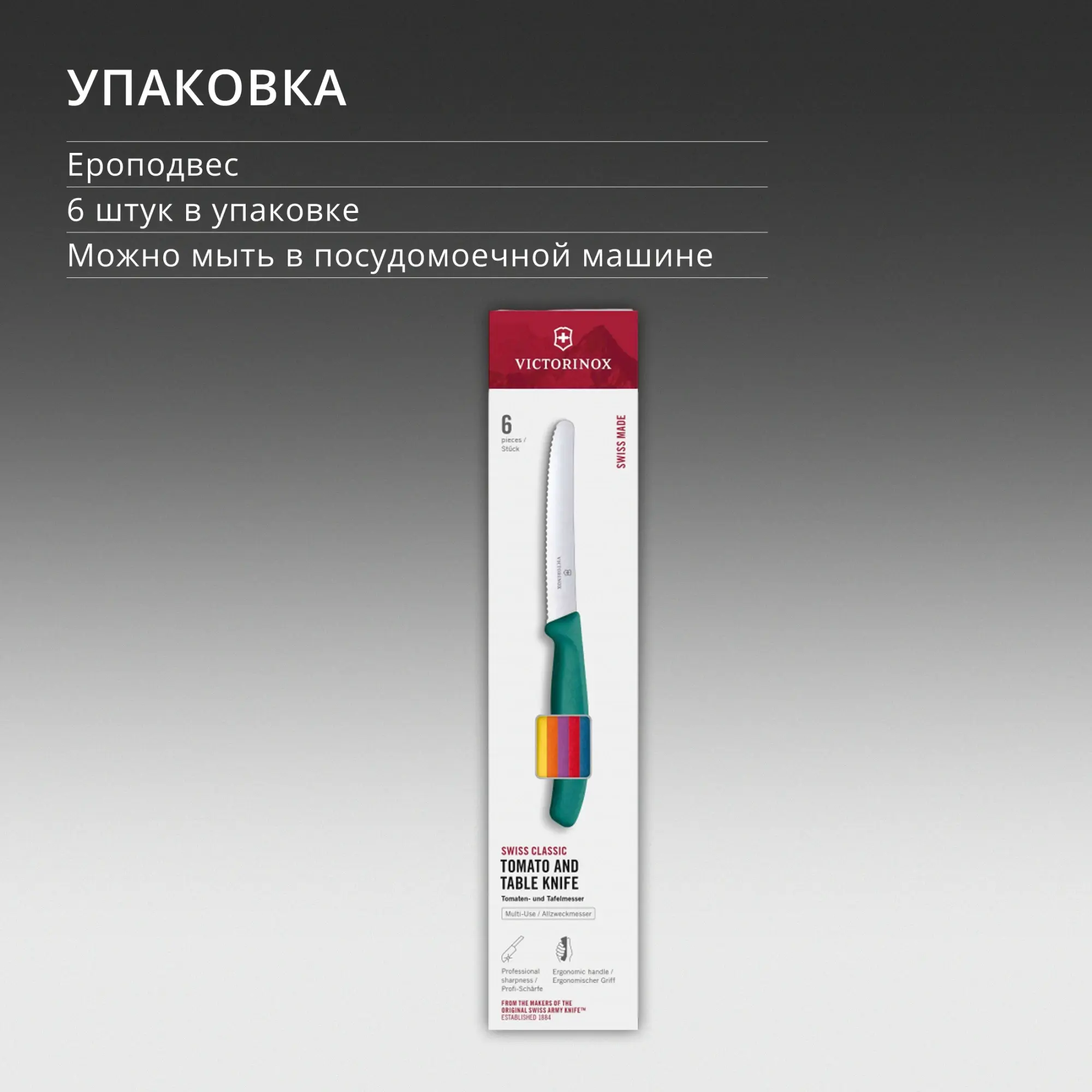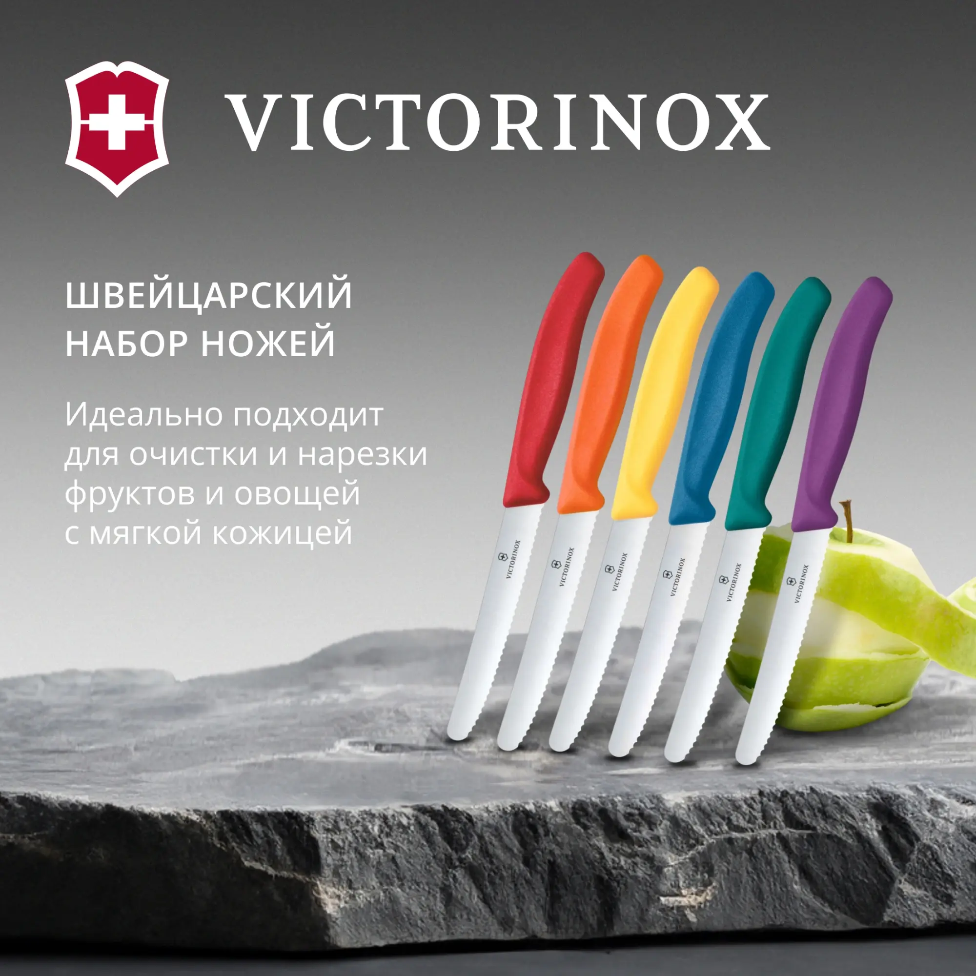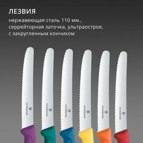 Универсальные швейцарские кухонные ножи Victorinox с 11-сантиметровым зубчатым лезвием идеально подходят для нарезки овощей, фруктов, сосисок, колбас, стейков, небольших кусков мяса и кондитерских изделий.