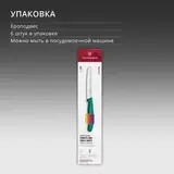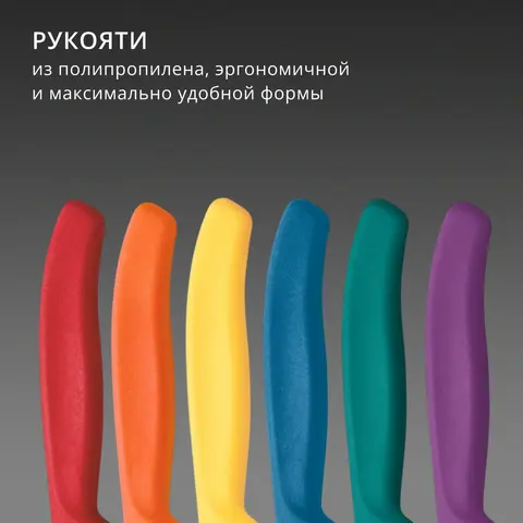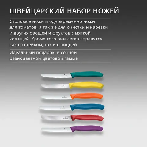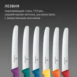 Набор состоит из 6-ти разноцветных универсальных ножей с супер острой серрейторной заточкой и закруглённым кончиком лезвия.