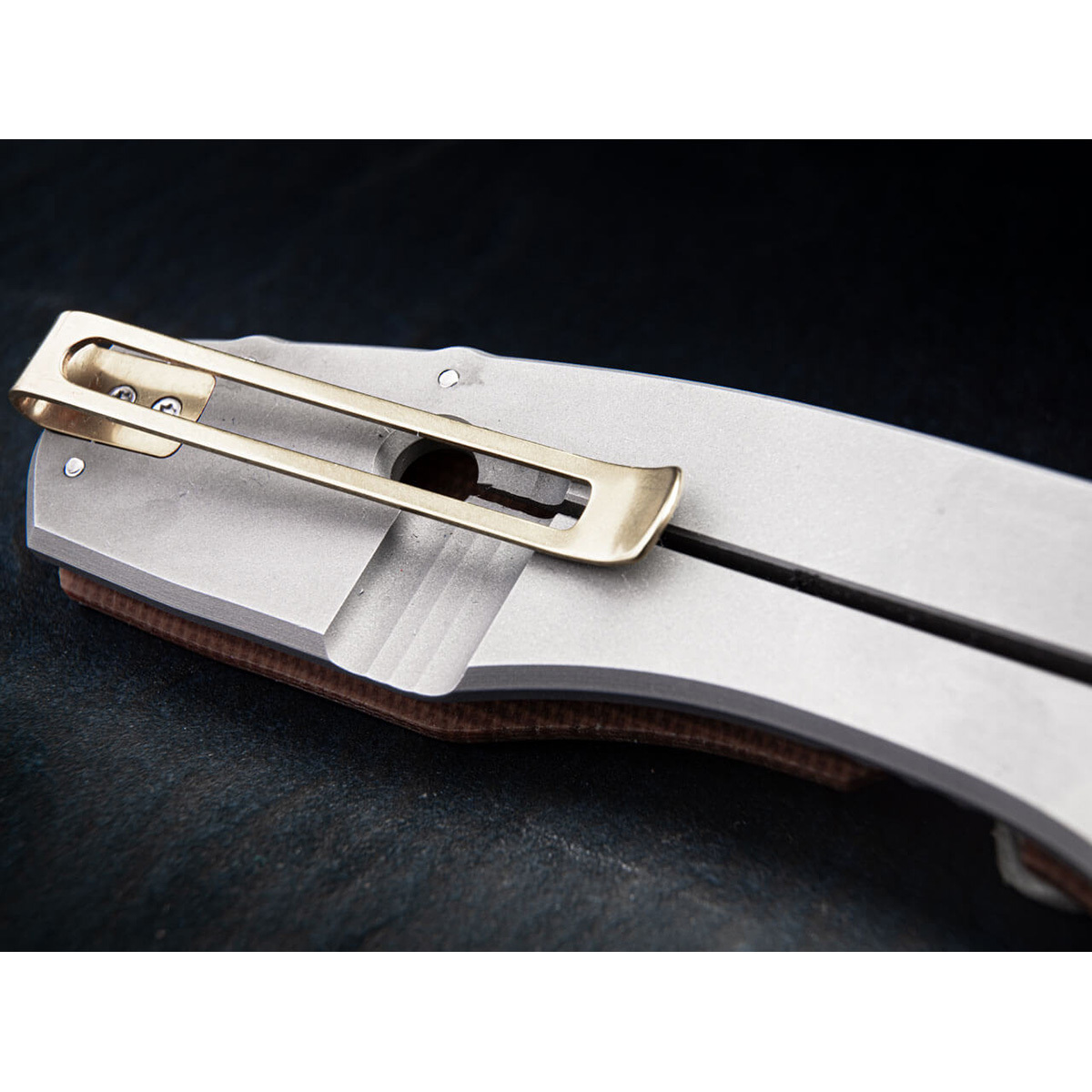 Рукоять выполнена из микарты — это конструкционный композитный материал, представляющий собой слоистый пластик на основе ткани и полимерного связующего вещества. Он прочный, не впитывает ни воду, ни запахи, тактильный и высоко декоративный. Кроме того, текстолит хорошо переносит значительные перепады температуры.