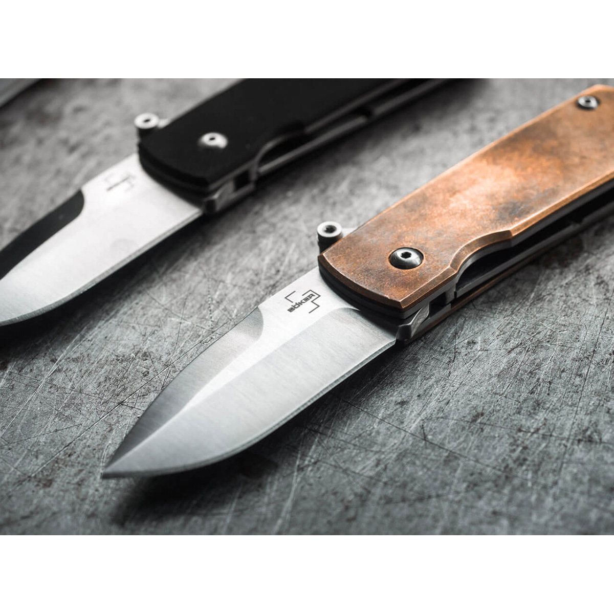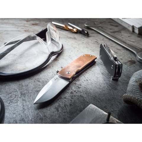 Рукоятка изготовлена из сплава меди. Медь имеет более плотную структуру, чем нержавеющая сталь или алюминий, поэтому такая рукоятка придаёт ножу вес. Медь выглядит стильно и создаёт достаточно уникальный образ.