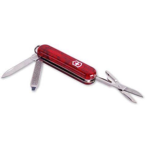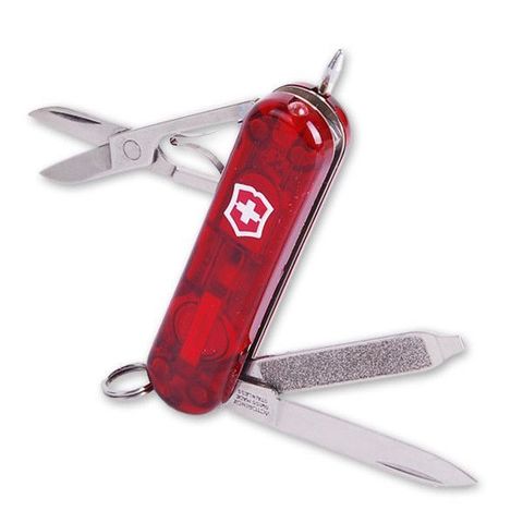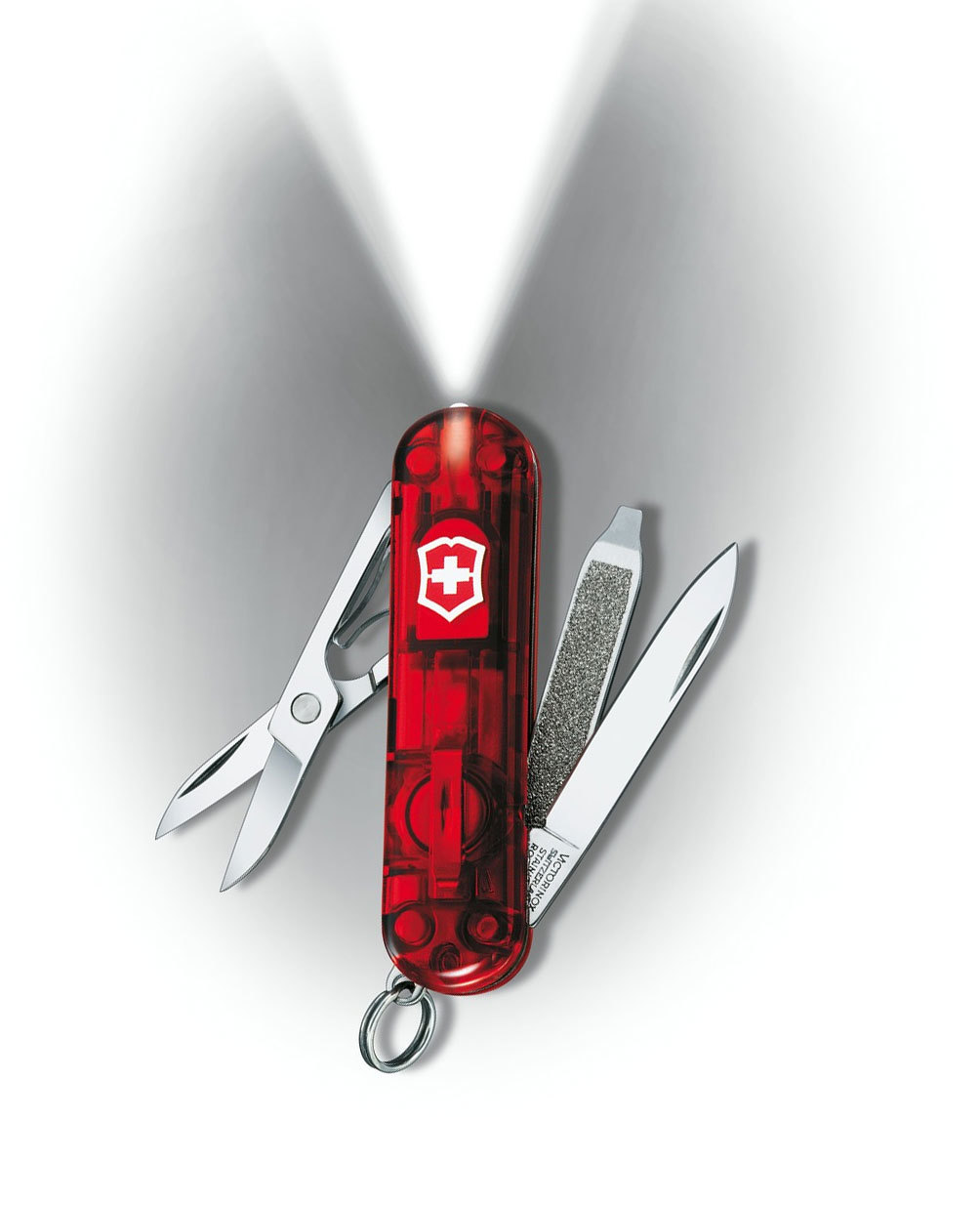 Victorinox Signature Lite Red Trans - складной нож-брелок в красном полупрозрачном цвете с шариковой ручкой и светодиодным фонариком. Используя этот компактный аксессуар в качестве брелока для ключей, у Вас всегда под рукой будут маникюрный набор, нож, отвертка, фонарик и ручка.