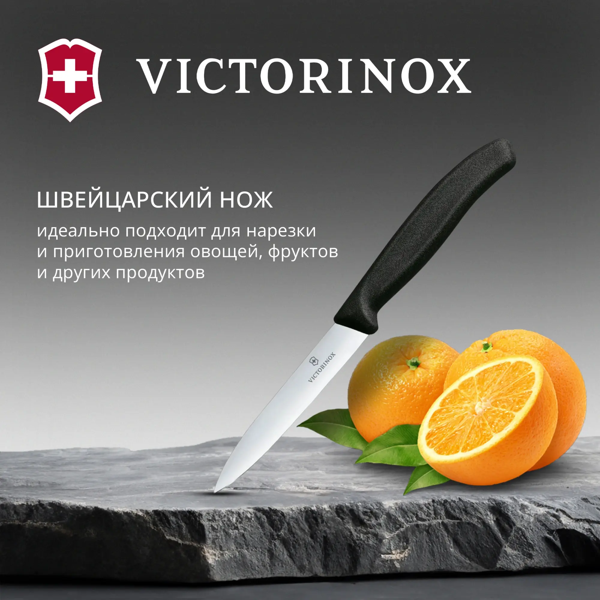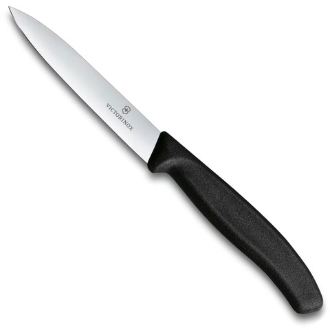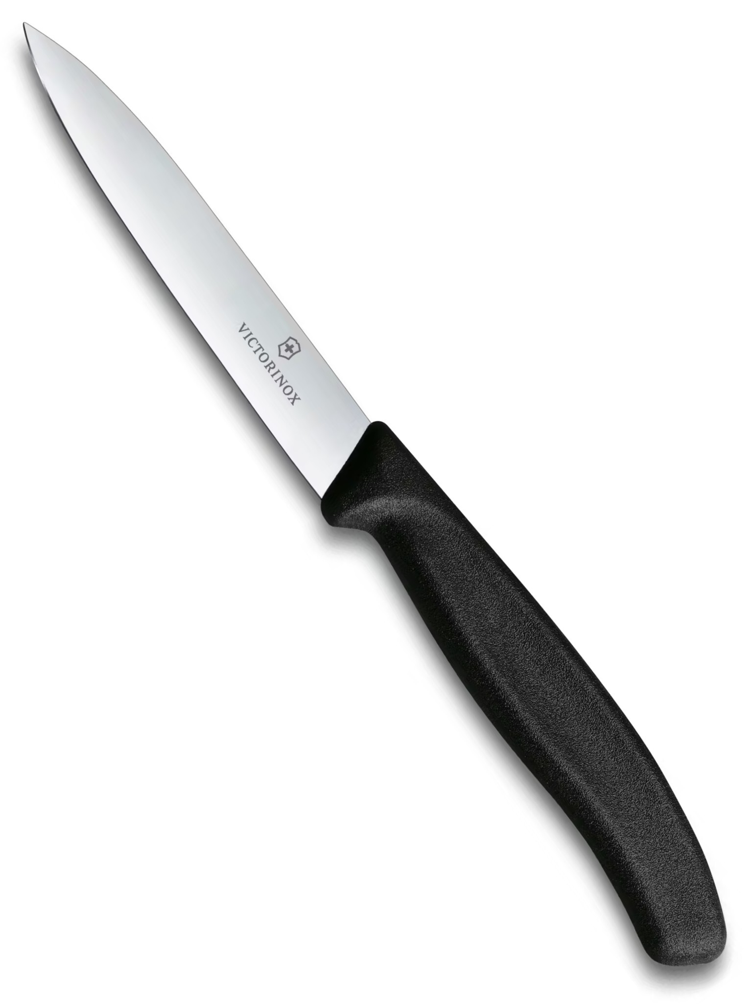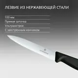 Отличный универсальный нож для кухни. Эргономичная пластиковая рукоять, лезвие 10 см из высококачественной нержавеющей стали, прямая (плейновая) заточка, острый кончик. Идеально подходит для нарезки овощей, фруктов, зелени, стейка, колбасы, сосисок, пиццы, небольших кусков мяса. Сверхострое лезвие режет без усилий и сохраняет остроту на долгие годы.