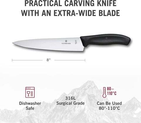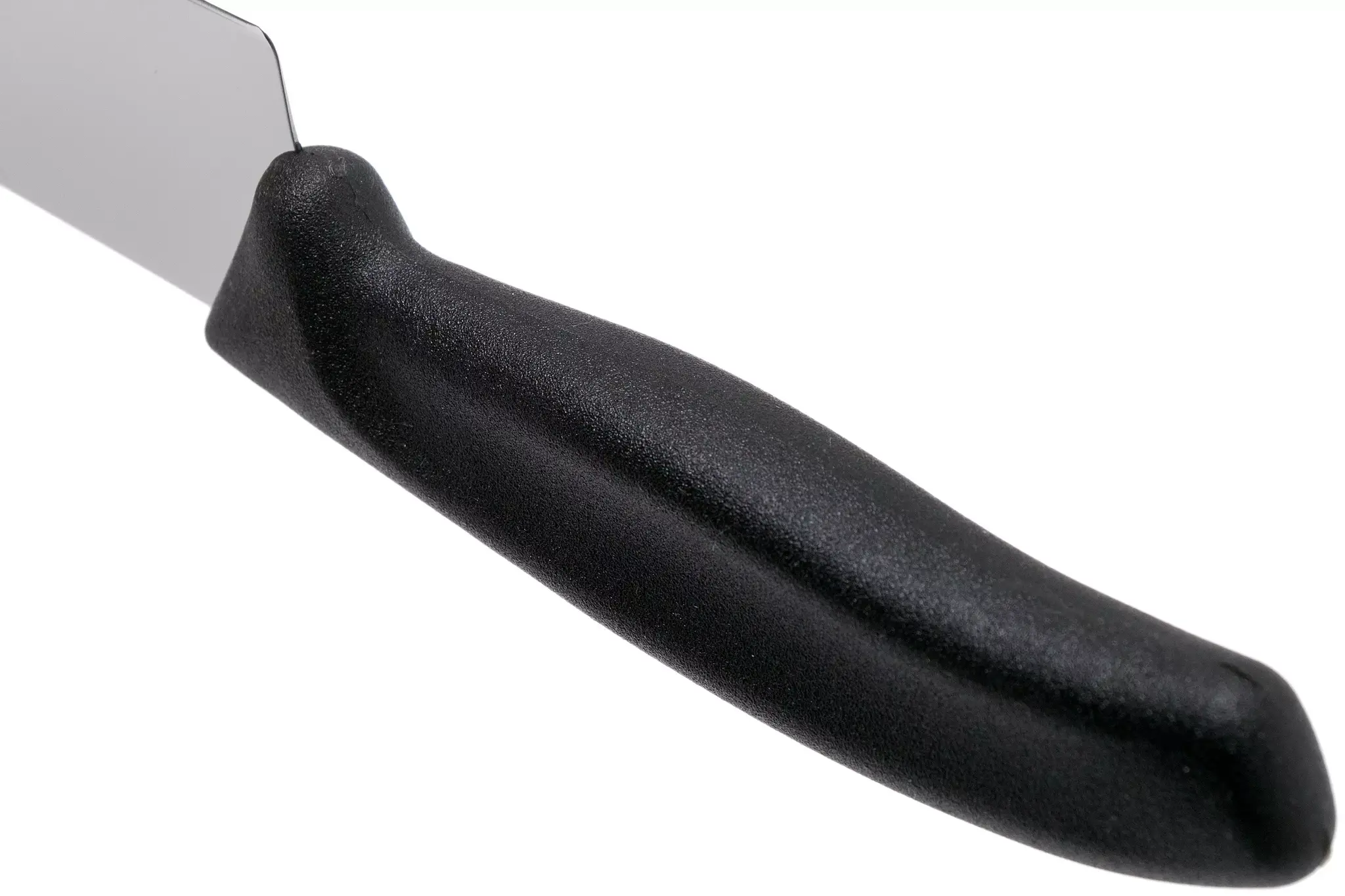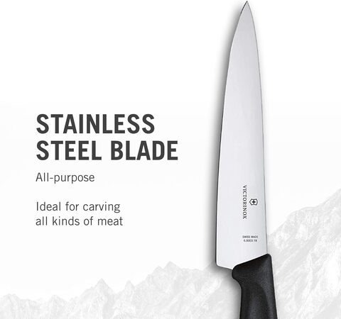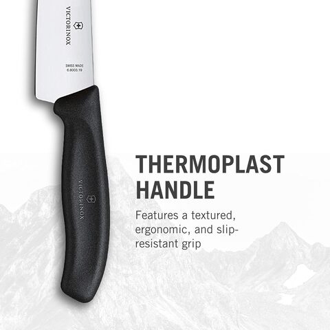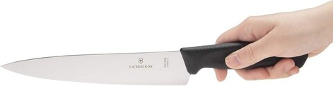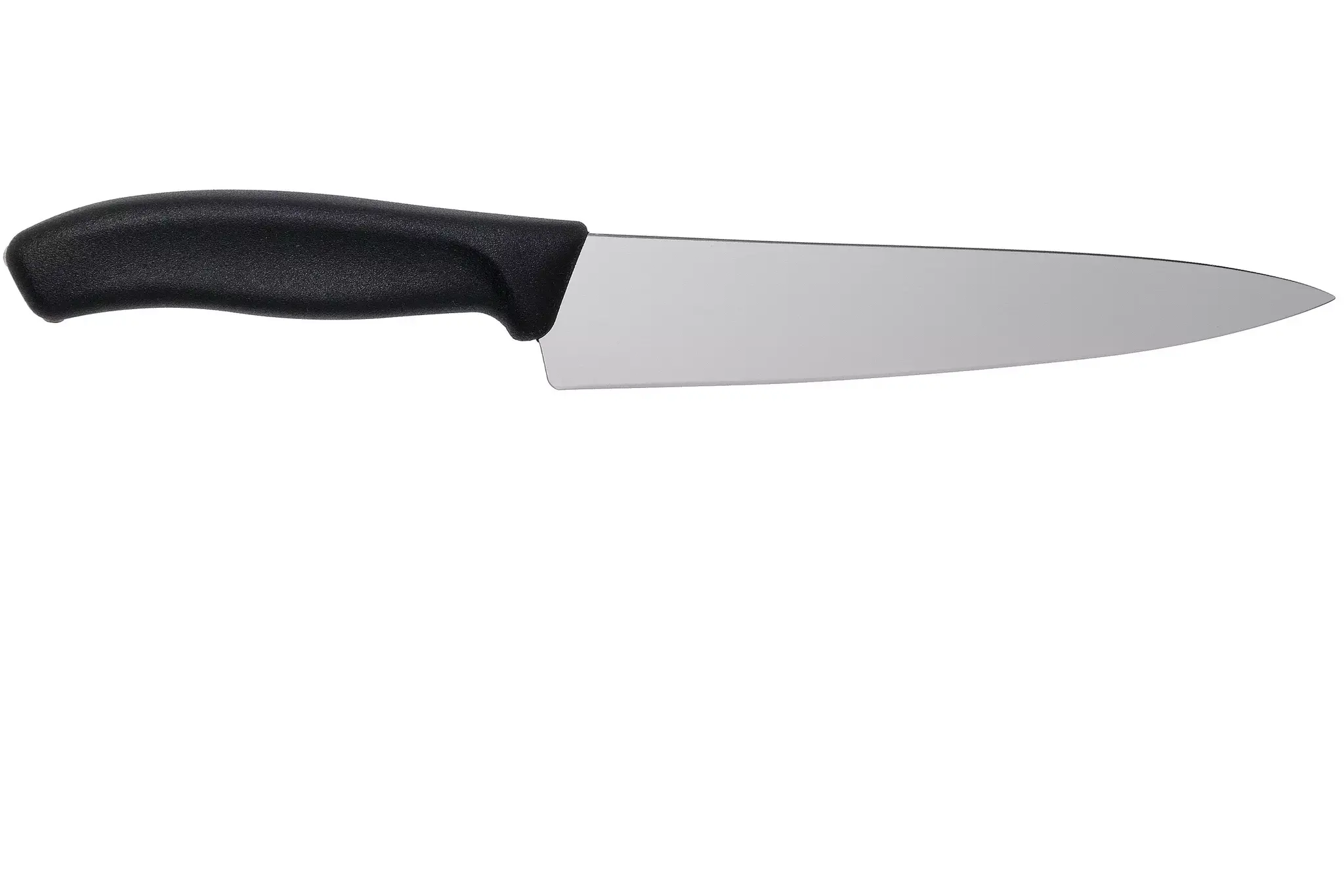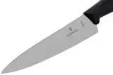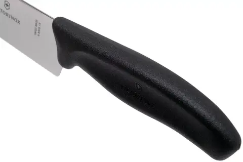 Кухонный разделочный нож Victorinox 6.8003.19B с чёрной пластиковой рукоятью и 19-ти сантиметровым лезвием из высококачественной нержавеющей стали. Поставляется в красивом картонном блистере. Лезвие швейцарского ножа позволяет быстро и легко справится с нарезанием мяса, филе, мягких и твердых овощей и фруктов