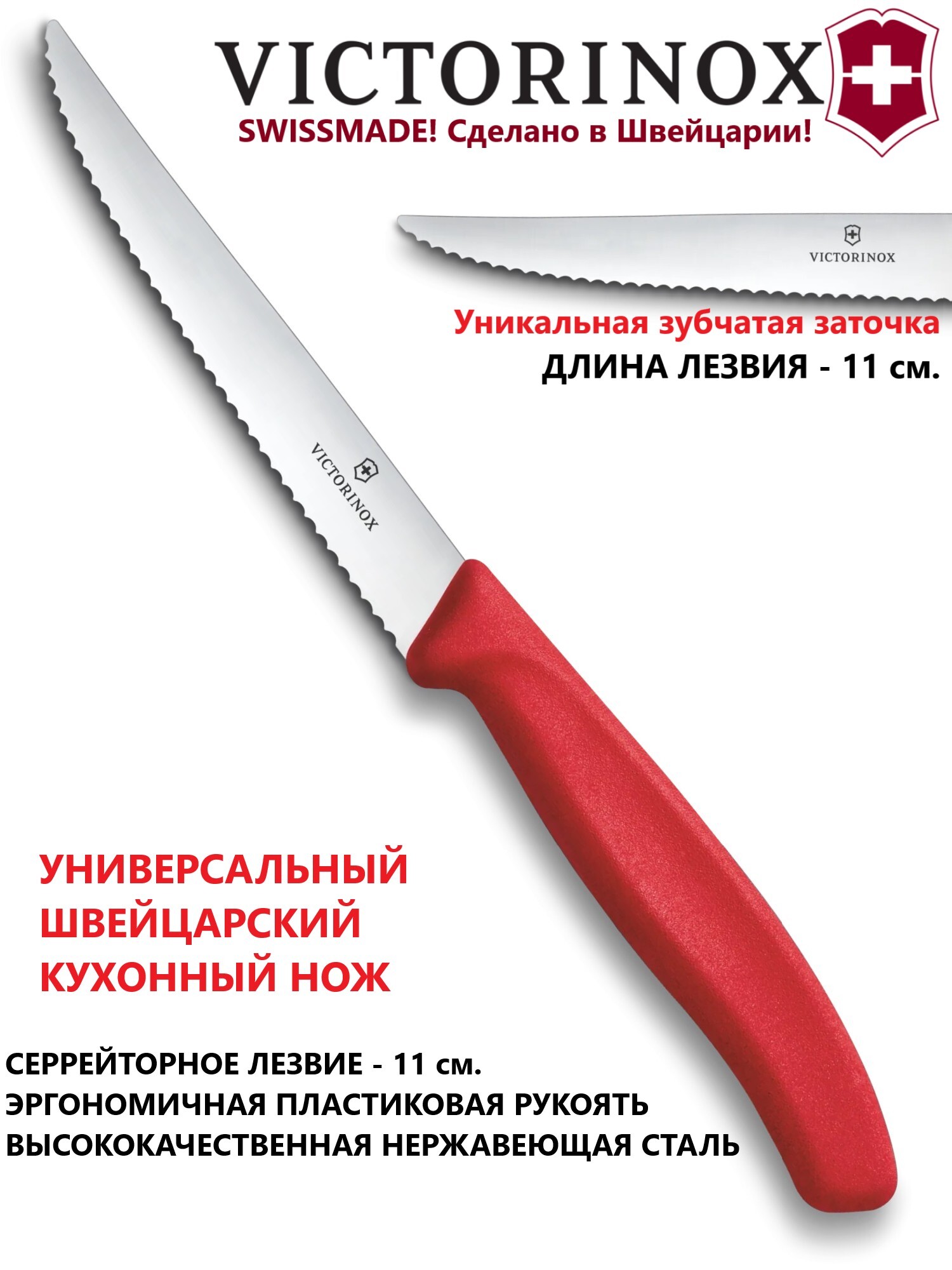 Отличный универсальный нож для кухни. Эргономичная пластиковая рукоять, лезвие 11 см из высококачественной нержавеющей стали, волнообразная (серрейторная) заточка, острый кончик. Идеально подходит для нарезки стейка, колбасы, сосисок, пиццы, небольших кусков мяса, овощей и фруктов. Благодаря уникальной серрейторной заточке, сверхострое лезвие режет без усилий и сохраняет остроту на долгие годы.