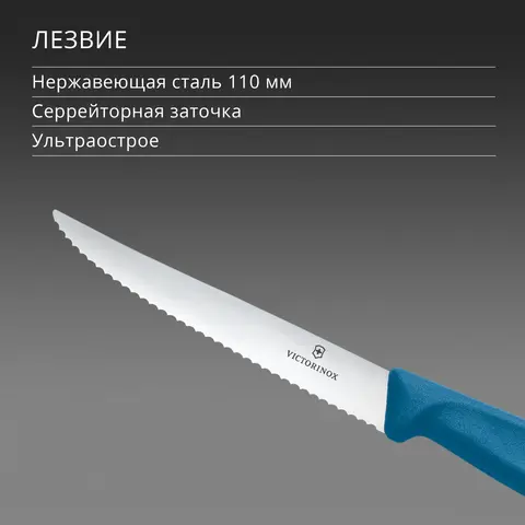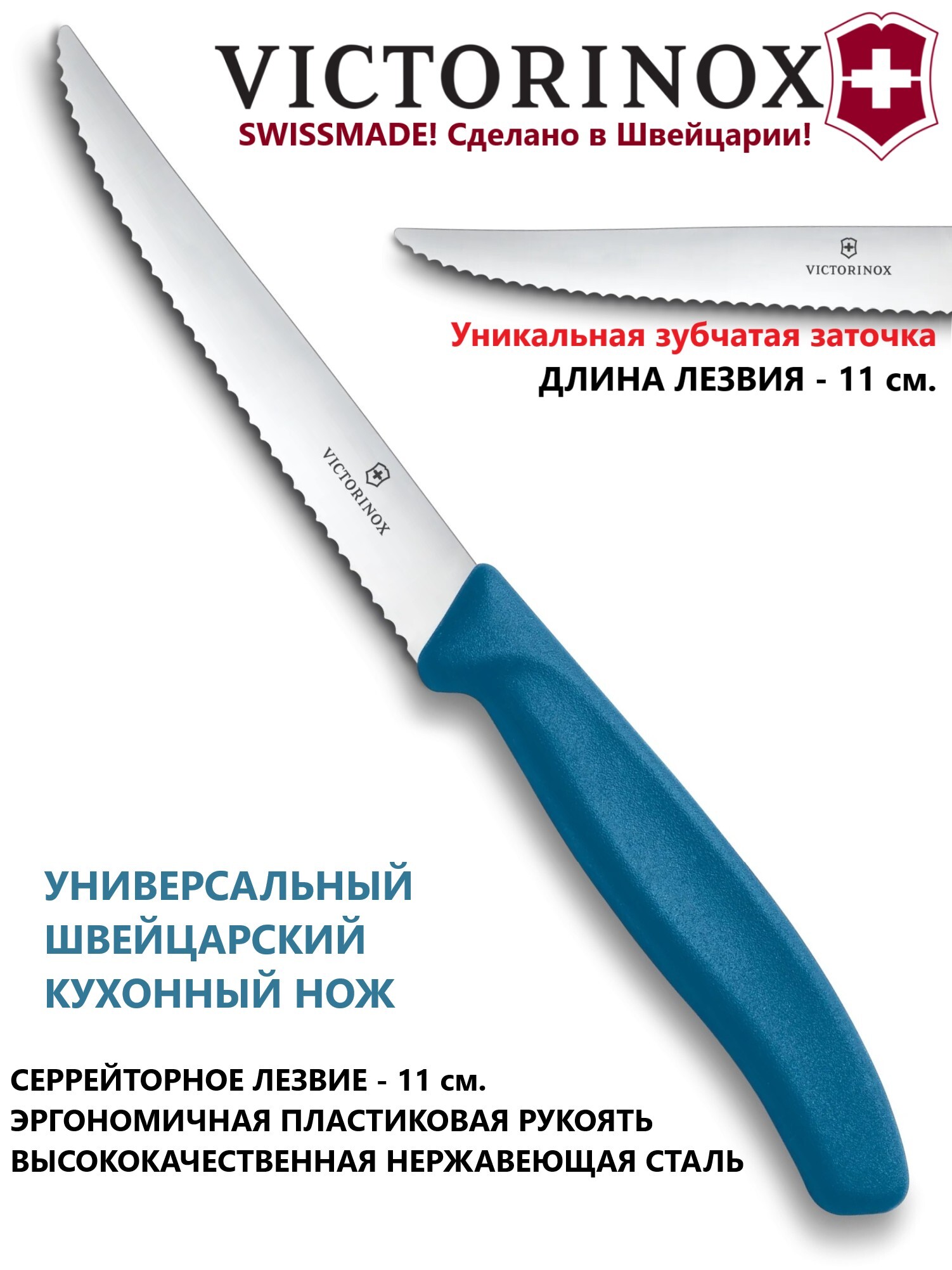 Отличный универсальный нож для кухни. Эргономичная пластиковая рукоять, лезвие 11 см из высококачественной нержавеющей стали, волнообразная (серрейторная) заточка, острый кончик. Идеально подходит для нарезки стейка, колбасы, сосисок, пиццы, небольших кусков мяса, овощей и фруктов. Благодаря уникальной серрейторной заточке, сверхострое лезвие режет без усилий и сохраняет остроту на долгие годы.