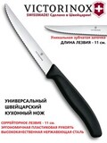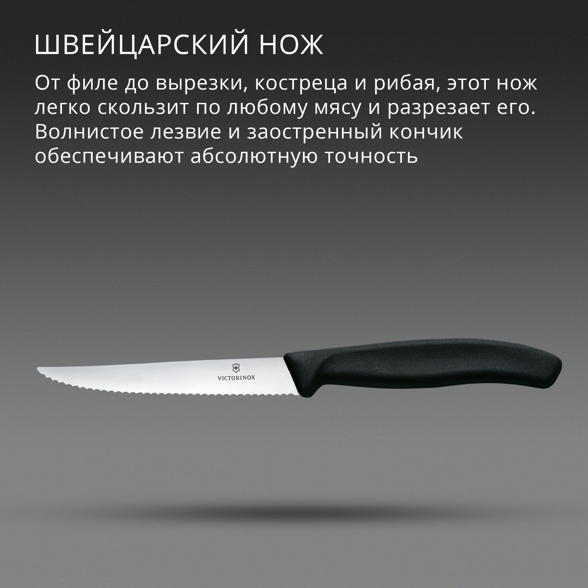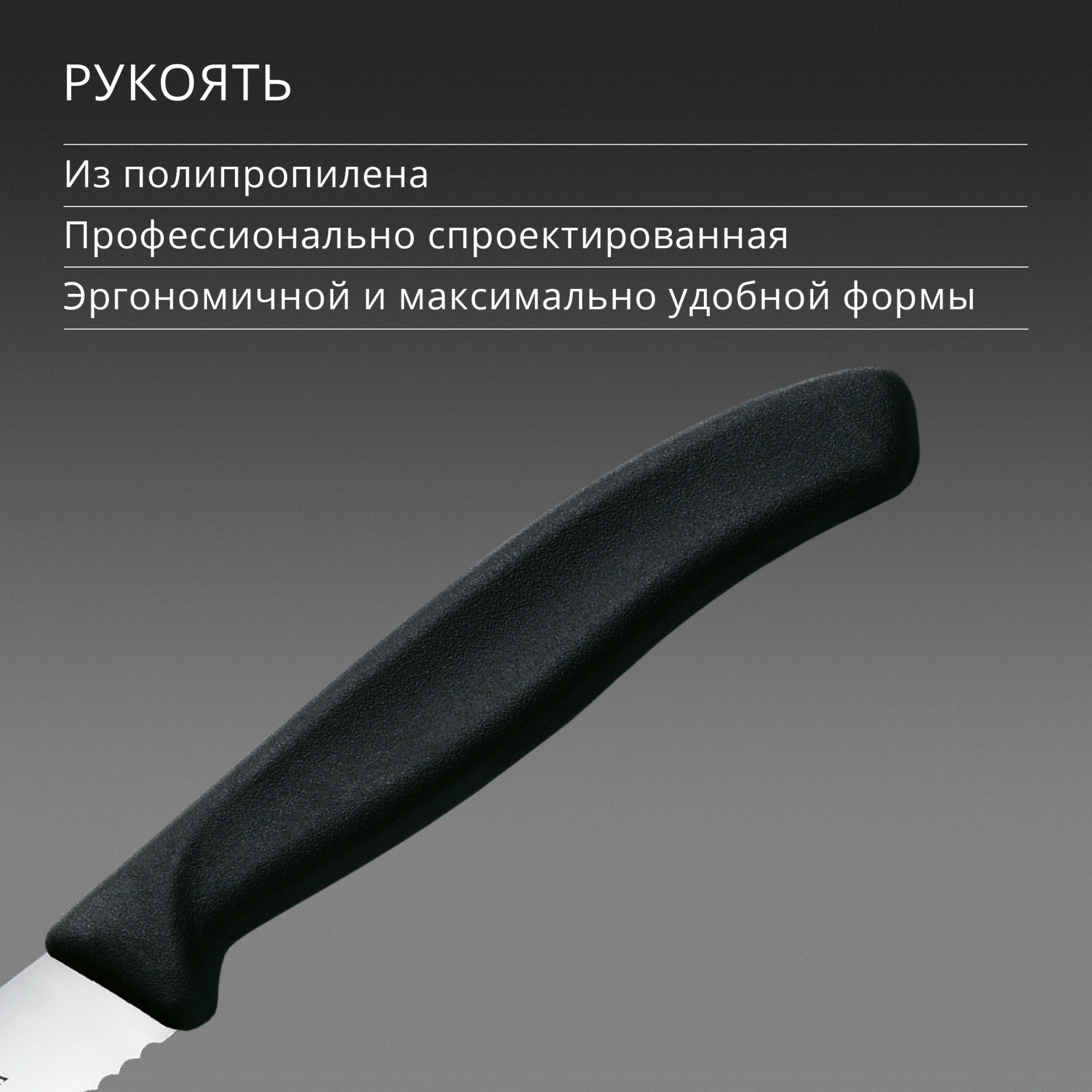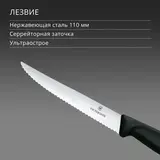 Отличный универсальный нож для кухни. Эргономичная пластиковая рукоять, лезвие 11 см из высококачественной нержавеющей стали, волнообразная (серрейторная) заточка, острый кончик. Идеально подходит для нарезки стейка, колбасы, сосисок, пиццы, небольших кусков мяса, овощей и фруктов. Благодаря уникальной серрейторной заточке, сверхострое лезвие режет без усилий и сохраняет остроту на долгие годы.