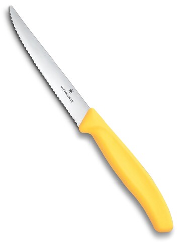 Отличный универсальный нож для кухни. Эргономичная пластиковая рукоять, лезвие 11 см из высококачественной нержавеющей стали, волнообразная (серрейторная) заточка, острый кончик. Идеально подходит для нарезки стейка, колбасы, сосисок, пиццы, небольших кусков мяса, овощей и фруктов. Благодаря уникальной серрейторной заточке, сверхострое лезвие режет без усилий и сохраняет остроту на долгие годы.