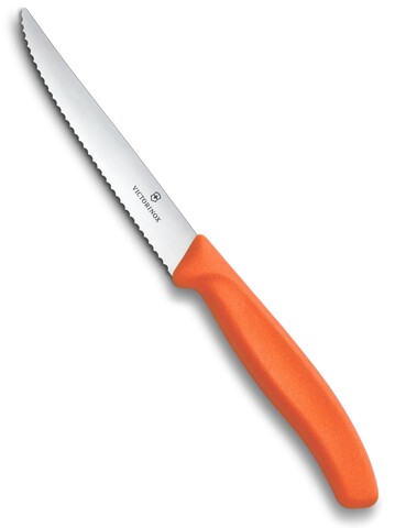 Отличный универсальный нож для кухни. Эргономичная пластиковая рукоять, лезвие 11 см из высококачественной нержавеющей стали, волнообразная (серрейторная) заточка, острый кончик. Идеально подходит для нарезки стейка, колбасы, сосисок, пиццы, небольших кусков мяса, овощей и фруктов. Благодаря уникальной серрейторной заточке, сверхострое лезвие режет без усилий и сохраняет остроту на долгие годы.