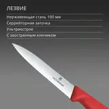 Отличный универсальный нож для кухни. Эргономичная пластиковая рукоять, лезвие 10 см из высококачественной нержавеющей стали, волнообразная (серрейторная) заточка, острый кончик. Идеально подходит для нарезки овощей, фруктов, зелени, стейка, колбасы, сосисок, пиццы, небольших кусков мяса. Благодаря уникальной серрейторной заточке, сверхострое лезвие режет без усилий и сохраняет остроту на долгие годы.