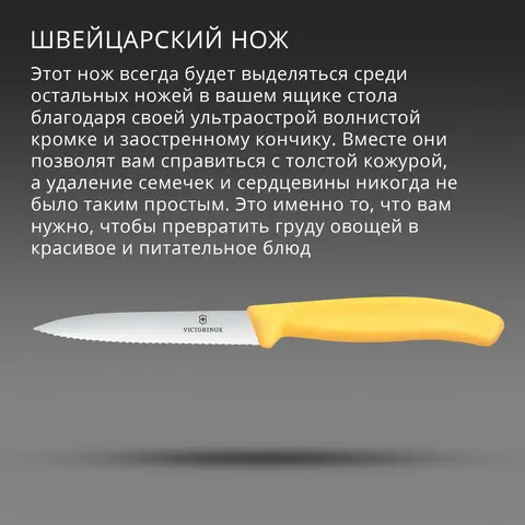 Отличный универсальный нож для кухни. Эргономичная пластиковая рукоять, лезвие 10 см из высококачественной нержавеющей стали, волнообразная (серрейторная) заточка, острый кончик. Идеально подходит для нарезки овощей, фруктов, зелени, стейка, колбасы, сосисок, пиццы, небольших кусков мяса. Благодаря уникальной серрейторной заточке, сверхострое лезвие режет без усилий и сохраняет остроту на долгие годы.