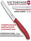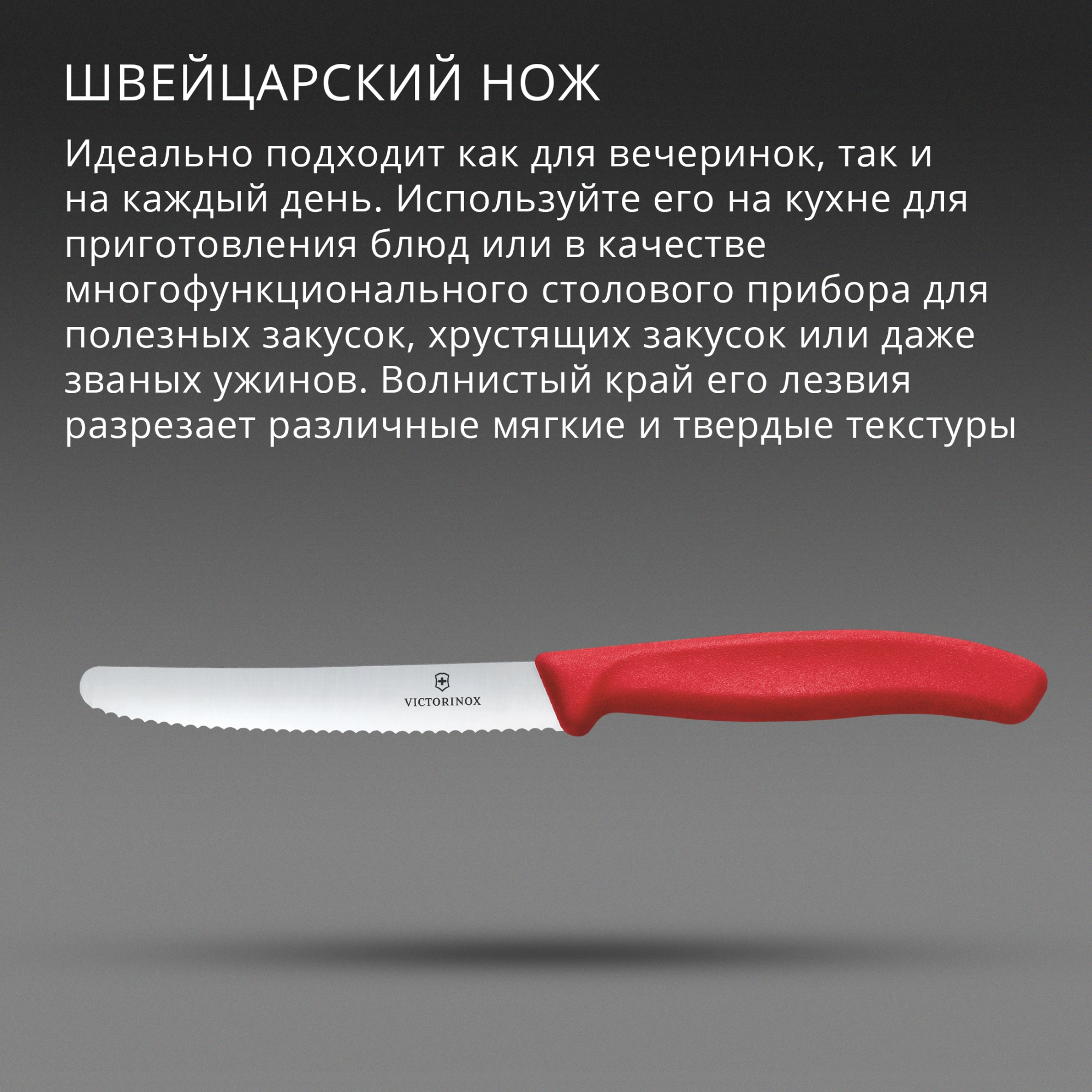 Универсальный швейцарский кухонный нож Victorinox с 11-сантиметровым зубчатым лезвием идеально подходит для нарезки овощей, фруктов, сосисок, колбас, стейков, небольших кусков мяса и кондитерских изделий. Благодаря эргономичной ручке и идеальному размеру вы можете легко использовать этот нож для самых разных задач на кухне.
