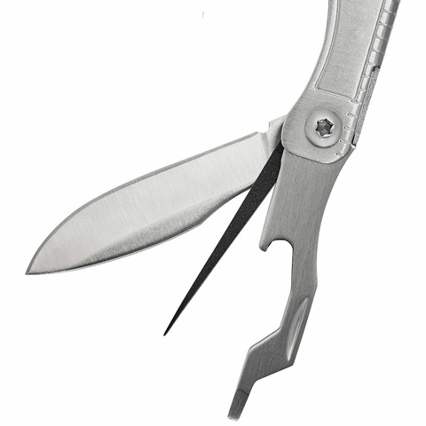 Полностью металлический мультитул SOG Snippet в сложенном виде достигает почти 69 мм, и весит не более 57 грамм. Инструменты и накладки на рукоятку изготовлены из отшлифованной нержавеющей стали с сатиновой обработкой, а непосредственно для создания основного клинка применяется сталь марки 5CR13MOV с заявленной твердость в пределах 54-56 единиц по шкале HRC. Полная длина клинка не превышает 44.5 мм.