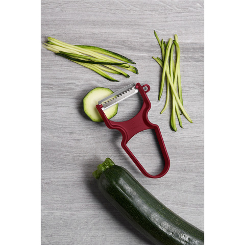• Практичная овощечистка для нарезки соломкой с пластиковой рукоятью в стильном цвете