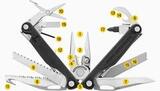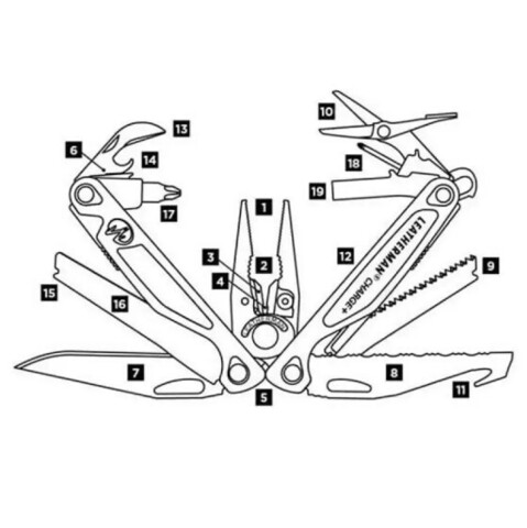 1. Острогубцы 2. Пассатижи 3. Сменные кусачки для твердой проволоки 4. Сменные кусачки для проволоки 5. Обжим (Электрические щипцы) 6. Инструменты для зачистки проводов 7. Нож 154CM 8. Серрейторный нож, сталь 420HC 9. Пила 10. Ножницы с пружинящим механизмом | 11. Режущий крюк 12. Линейка (19 см) 13. Открывалка для консервов 14. Открывалка для бутылок 15. Напильник по дереву / металлу 16. Напильник с алмазоподобным покрытием 17. Держатель для больших бит (I) 18. Держатель для малых бит 19. Средняя отвертка |