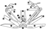 1. Острогубцы 2. Пассатижи 3. Сменные кусачки для твердой проволоки 4. Сменные кусачки для проволоки 5. Обжим (Электрические щипцы) 6. Инструмент для зачистки проводов 7. Нож S30V® 8. Серрейторный нож, сталь 420HC 9. Пила 10. Ножницы с пружинящим механизмом | 11. Режущий крюк 12. Линейка (19 см) 13. Открывалка для консервов 14. Открывалка для бутылок 15. Напильник по дереву / металлу 16. Напильник с алмазоподобным покрытием 17. Держатель для больших бит (I) 18. Держатель для малых бит 19. Средняя отвертка |