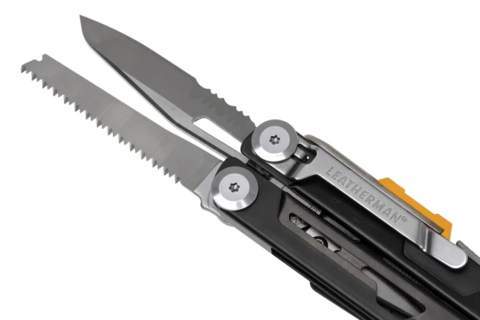На этом функциональность мультитула не заканчивается. Реально у человека в руке 19 инструментов: молоток, сменные кусачки особой прочности из стали 154CM, универсальный нож (одна половина прямая, а вот вторая получила волнообразную заточку). Острый стальной клинок 420HC с выемкой для удобного открывания одним пальцем. Главный инструмент – универсальные пассатижи, они же кусачки и острогубцы, есть держатели для бит, алмазный надфиль, набор отверток и пила.