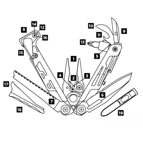 На этом функциональность мультитула не заканчивается. Реально у человека в руке 19 инструментов: молоток, сменные кусачки особой прочности из стали 154CM, универсальный нож (одна половина прямая, а вот вторая получила волнообразную заточку). Острый стальной клинок 420HC с выемкой для удобного открывания одним пальцем. Главный инструмент – универсальные пассатижи, они же кусачки и острогубцы, есть держатели для бит, алмазный надфиль, набор отверток и пила.