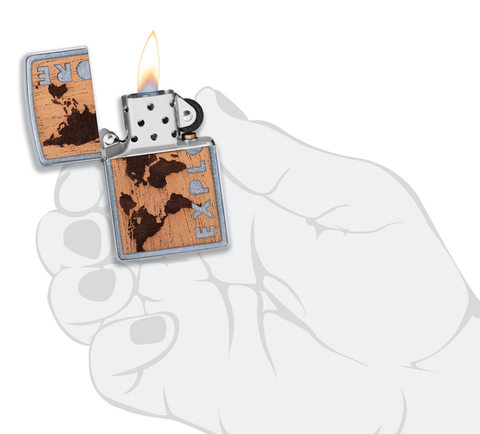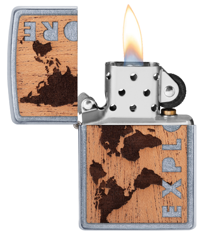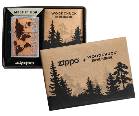 Zippo при партнерской поддержке WOODCHUCK, США и их программы BUY ONE. PLANT ONE.® гарантирует, что за каждую купленную зажигалку будет посажено по одному дереву. При создании этих зажигалок применялась технология формирования эмблем лазером на поверхности из натурального дерева, которая поможет восстановить и защитить мировые леса. Покупатель с помощью специального кода, указанного на каждой коробке, может узнать судьбу «своего» дерева. На обеих сторонах этой зажигалки Street Chrome™ размещены эмблемы из красного дерева с условной картой мира. Параллельно карте с помощью хромирования нанесено слово 'Explore' (Исследуй). Зажигалки упакованы в уникальные коробки, которые позволяют рассмотреть лицевую часть и описанный выше код модели. Чтобы гарантировать оптимальную работу заполнять следует топливом для зажигалок Zippo.