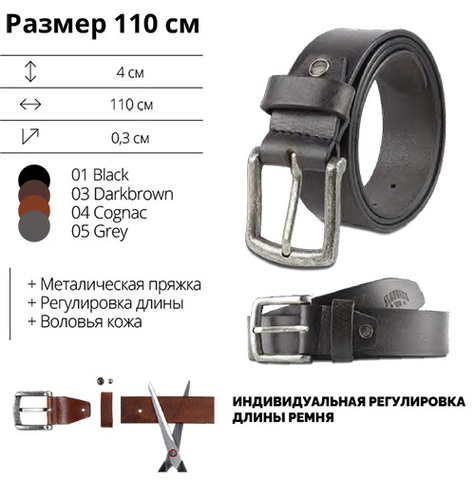 Натуральная воловья кожа. Размер ремня: 110 х 4 см. Общая длина ремня с пряжкой: 132 см.
