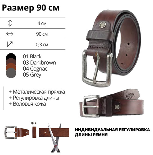 Натуральная воловья кожа. Размер ремня: 90 х 4 см. Общая длина ремня с пряжкой: 111 см.