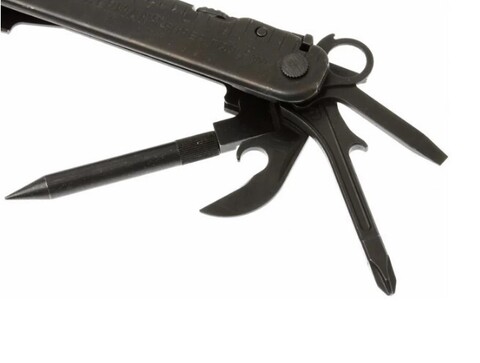 1. Острогубцы 2. Кусачки для многожильного провода 3. Сменные кусачки для запального провода, сталь 154CM 4. Обжим для военных нужд 5. Обжим 6. Инструмент для зачистки проводов 7. Универсальный нож, сталь 420HC 8. Пила 9. Сменная пила 10. Съемный пробойник C4 | 11. Шомпол / Адаптер для щетки 12. Шило с ушком и винтовой петлей 13. Линейка (22 cm) 14. Открывалка для консервов 15. Открывалка для бутылок 16. Отвертка Phillips 17. Большая отвертка 18. Средняя отвертка 19. Малая отвертка |