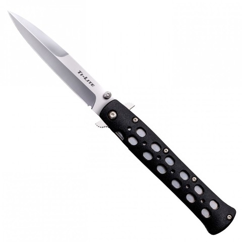 Изюминкой ножа является его замок - модифицированный Liner-lock (патент Cold Steel) с Г-образным профилем. При открывании ножа, лайнер проваливается почти на всю толщину клинка, и упор пятки клинка происходит во весь Г-образный профиль. Благодаря этому площадь их контакта сильно увеличена, по сравнению с обычным прямым лайнером. На самой пятке сделано шершавое напыление (либо специальная обработка). В результате, чем сильнее мы давим на клинок, не отжимая лайнера, тем больше будет сила трения между ними. Кроме того, для предотвращения деформации самого лайнера, на нем проштамповано ребро жесткости.