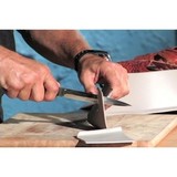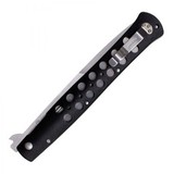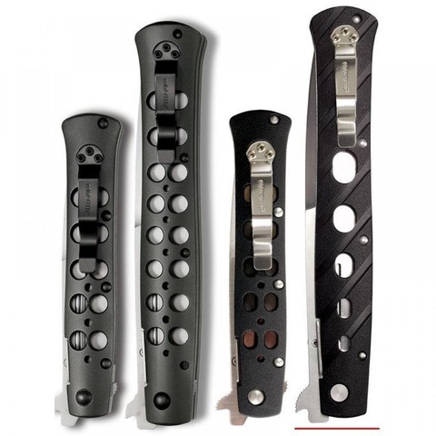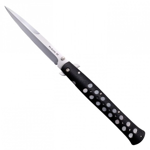 Изюминкой ножа является его замок - модифицированный Liner-lock (патент Cold Steel) с Г-образным профилем. При открывании ножа, лайнер проваливается почти на всю толщину клинка, и упор пятки клинка происходит во весь Г-образный профиль. Благодаря этому площадь их контакта сильно увеличена, по сравнению с обычным прямым лайнером. На самой пятке сделано шершавое напыление (либо специальная обработка). В результате, чем сильнее мы давим на клинок, не отжимая лайнера, тем больше будет сила трения между ними. Кроме того, для предотвращения деформации самого лайнера, на нем проштамповано ребро жесткости.