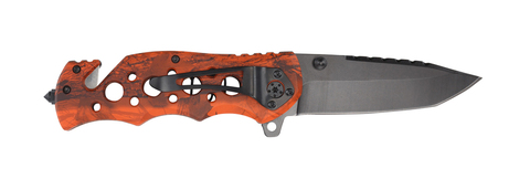 Материал лезвия: нержавеющая сталь марки 3Cr13 Материал рукояти: алюминий Фиксатор лезвия: Liner Lock Длина ножа: 217 мм Длина клинка: 86 мм Толщина клинка: 3 мм Вес: 147 г Цвет рукояти: оранжевый камуфляж Особенности: с клипом, стропорезом и инструментом для боя стекла Метод открывания клинка: флиппер (flipper, плавник) В комплекте: нейлоновый чехол