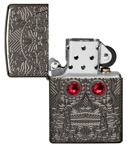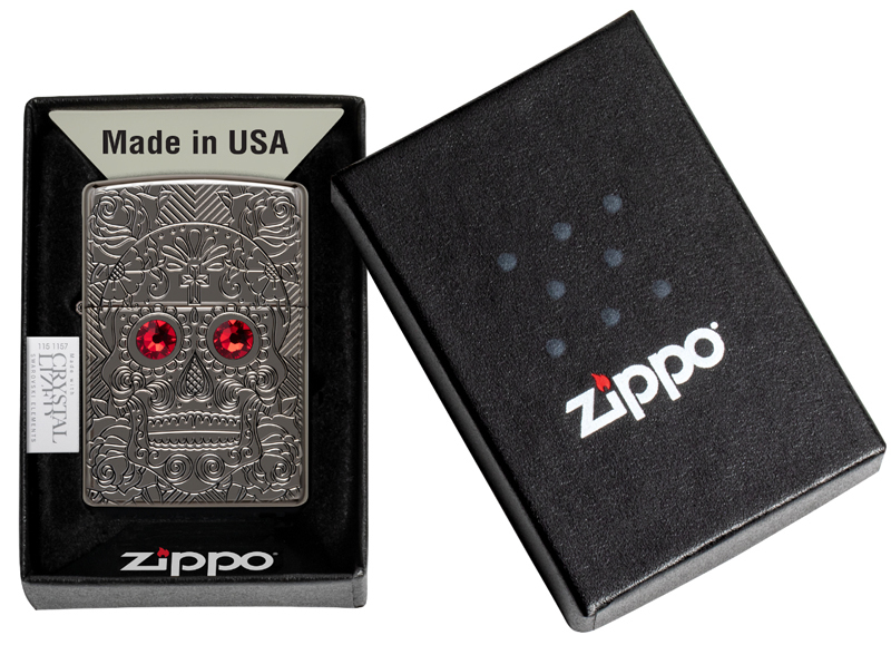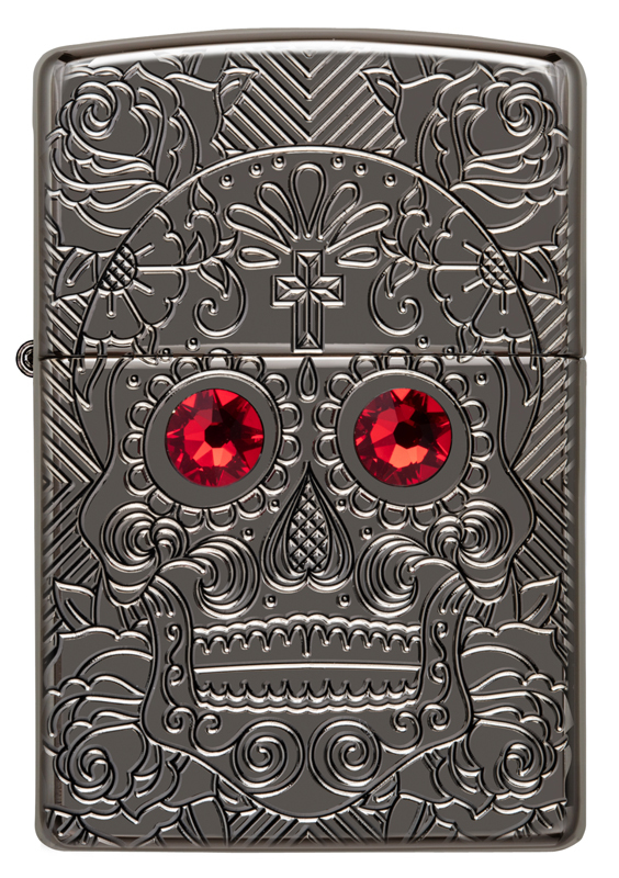 Вы когда-нибудь представляли себе такую вещь, как красота в смерти? Калавера или сахарный череп - традиционный символ, используемый для празднования Дня мертвых или Диа де лос Муэртос. В этом изделии используется традиционный дизайн сахарного черепа, нанесённого методом глубокого резного оттиска на переднюю часть зажигалки Armor High Polish Black Ice. Глаза черепа украшают ослепительно розовые кристаллы. Поставляется в подарочной коробке. Для оптимальной работы рекомендуется использовать только оригинальное топливо Zippo.