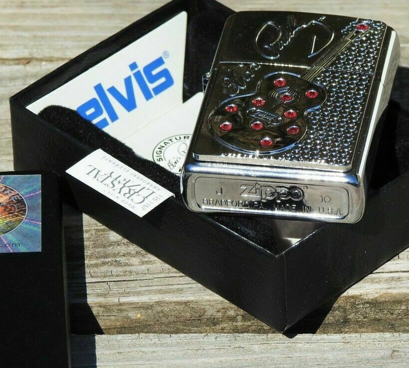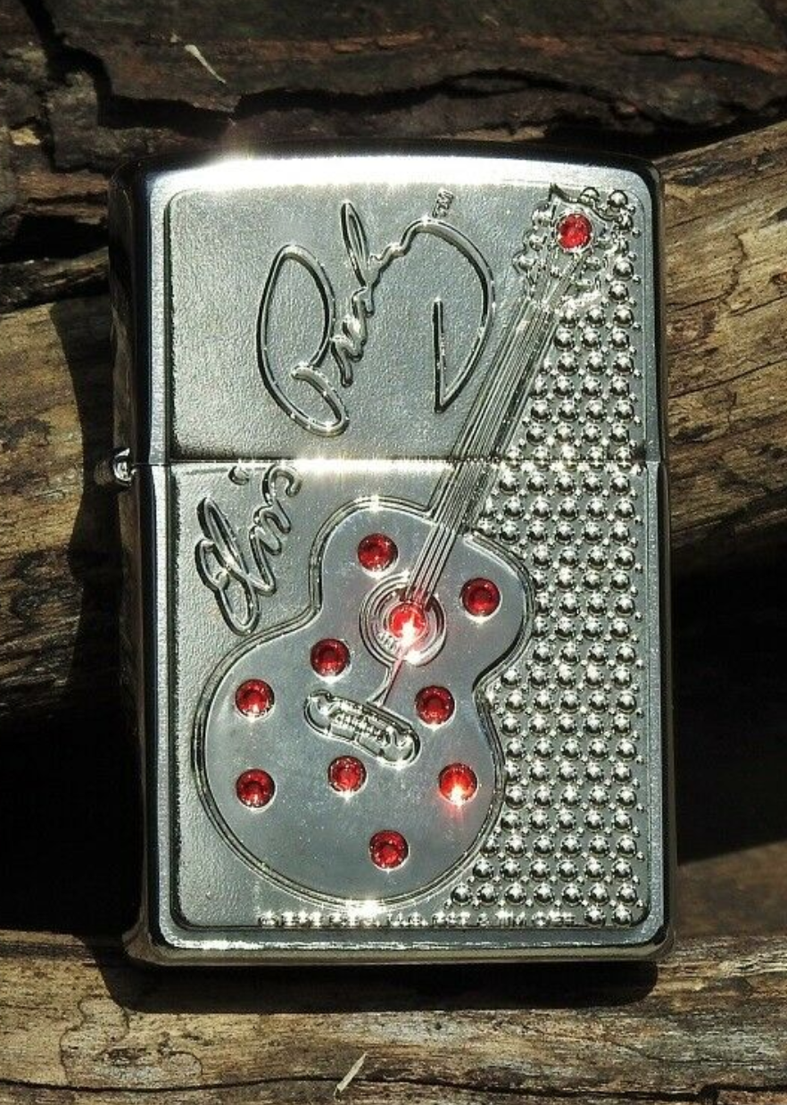 • Настоящая ветроустойчивая зажигалка Zippo с кристаллами Swarovski и гравировкой гитары Элвиса вместе с его подписью на лицевой стороне зажигалки