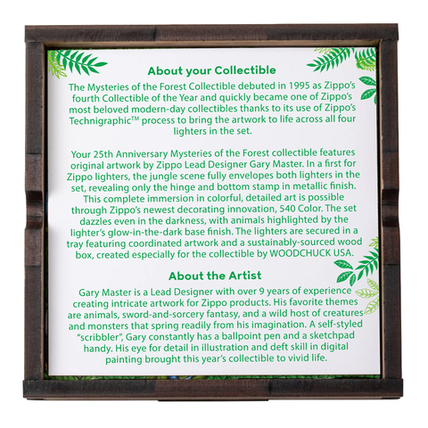 В честь празднования 25-й годовщины этих коллекционных моделей Zippo Mysteries of the Forest, которые впервые появились в 1995 году и вошли в число наиболее любимых, мы выпустили эту пару ветроустойчивых зажигалок с сочными кадрами из жизни джунглей, нанесенными при помощи нового технологического процесса Zippo 540 Color в сочетании с новейшим светящимся в темноте покрытием.